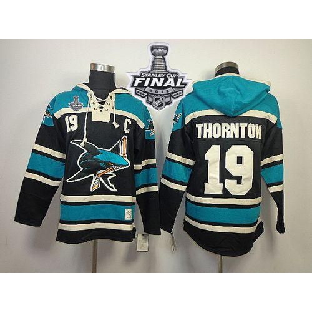 Sharks #19 Joe Thornton Black Sawyer Hooded Sweatshirt 2016 Stanley Cup Final Patch Stitched NHL Jersey